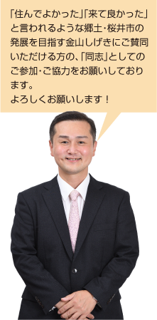 私の残りの人生のすべてを注ぎ込み、元気で豊かな笑顔あふれる桜井市を皆様とともに築きあげてまいりたい。そして今の少年少女たちに少しでも素敵な思い出を桜井市でたくさん作ってほしい。そんな想いを胸にこれまで同様、誠実に愚直に頑張ってまいります。